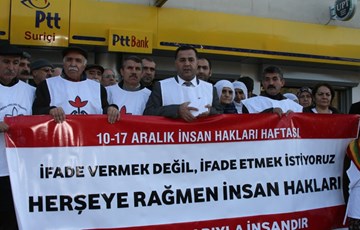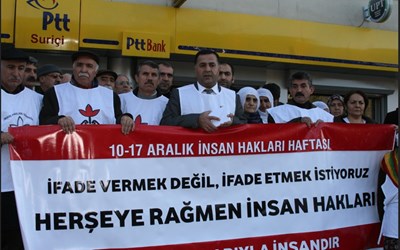 Sur Postanesi önünde bir araya gelen ve “İfade Vermek Değil İfade Etmek İstiyoruz, Her Şeye Rağmen İnsan Hakları” yazılı pankart açan insan hakları savunucuları adına kısa bir konuşma yapan İHD Diyarbakır Şube Sekreteri Raci Bilici, içinde bulundukları İnsan Hakları Haftası’nda halen çok sayıda insan hakları savunucusunun ve Kürt siyasetçilerinin cezaevinde olduğunu belirerek, “Bu ülkede insan hakları ve demokrasi mücadelesi verenler, bu ülkede bütün sorunları demokratik ve barışçıl yöntemlerle çözülmesini isteyenler, bu ülkede insanların ölmemesi için, barışın tesis edilebilmesi için, bu ülkede onurlu bir yaşam sürdürülebilmesi için mücadele veren arkadaşlarımız cezaevlerinde. Biz bugün burada cezaevinde bulunan insan hakları savunucularının şahsında, bu onurlu mücadeleyi sürdüren tüm cezaevindeki mahpuslar adına bu eylemi gerçekleştiriyoruz” dedi.