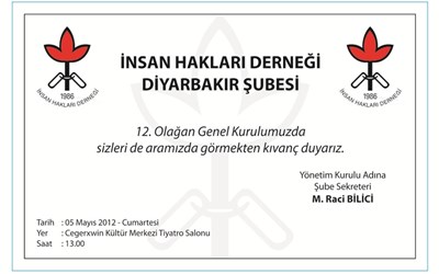 İHD Diyarbakır Şubesi, 12. Olağan Genel Kurulu’nu yarın gerçekleştirecek. Cegerxwin Kültür Merkezi’nde saat 13.00’te yapılacak kongreye, aralarında İHD Genel Başkanı Öztürk Türkdoğan, BDP’li milletvekilleri ve belediye başkanları, sivil toplum örgütü temsilcileri ve kongre delegeleri katılacak. Yoğun katılımın beklendiği kongrede, İHD’nin yeni yönetimi belirlenecek.