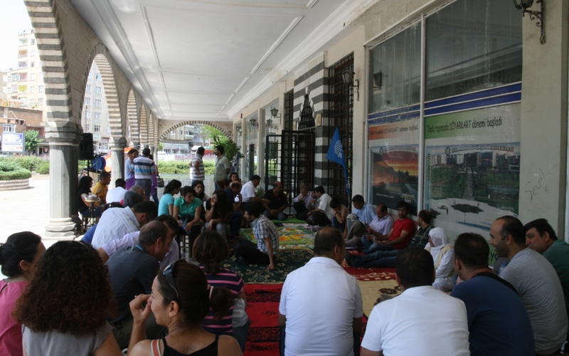 DİYARBAKIR – İHD Diyarbakır Şubesi, KESK’e yönelik operasyonları protesto etmek amacıyla Diyarbakır Büyükşehir Belediyesi Konukevi önünde oturma eylemi yapan KESK üyelerine destek ziyaretinde bulundu.