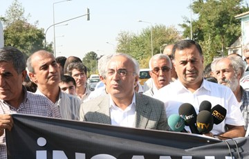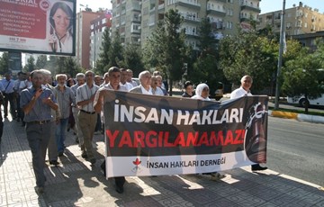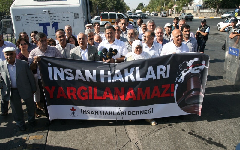 DİYARBAKIR – İHD’nin bugün görülmeye devam eden KCK ana davasına dikkat çekmek amacıyla gerçekleştirdiği yürüyüşte konuşan İHD Genel Başkanı Öztürk Türkdoğan, bir süre önce çıkarılan 3’üncü yargı paketiyle tutuklukla ilgili düzenlemelerin yapıldığını belirterek, “Ancak bu yargı paketinin tutuklamalarla ilgili düzenlemeleri ısrarla uygulanmıyor. Hiçbir şiddet eylemine karışmamış insanların bu kadar uzun süre tutuklu kalmasını bizler gibi kanun da bunu doğru bulmuyor. Ancak kanunlar uygulanmıyor. Esasen özel bir yargılama biçimi devam ettiriliyor” diye konuştu.
