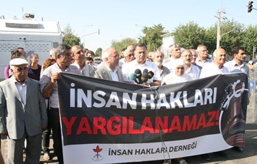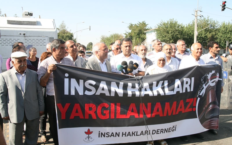 “İnsan Hakları Yargılanamaz” pankartı eşliğinde alkışlarla yürümeye başlayan İHD’liler, yürüyüşlerine Diyarbakır Adliyesi önünde sona erdirdi. Yürüyüşün sonunda Adliyenin giriş kapısı önünde basına bir açıklama yapan İHD Genel Başkanı Öztürk Türkdoğan, bugün devam eden davada insan hakları savunucularının yanı sıra, milletvekilleri, belediye başkanları, siyasetçiler ve çok sayıda aktivist yargılandığını belirterek, “Biz özellikle bugün Genel Başkan Yardımcımız Muharrem Erbey’in ve şube yöneticimiz Arslan Özdemir’in durumuna dikkat çekip, bu davada yargılanan ve haksız bir şekilde suçlanmaya devam eden insanların, özgürlüğünden mahrum bırakılan insanların biran önce salıverilmesini istiyoruz” dedi.