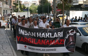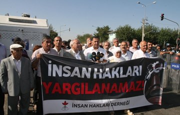 İHD Genel Merkezi ve tüm bölge şubeleri, bugün Diyarbakır 6. Ağır Ceza Mahkemesi’nde görülmeye devam eden KCK ana davasına dikkat çekmek ve davada insan hakları savunucularının yargılanmasına tepki göstermek amacıyla bir yürüyüş gerçekleştirdi. İHD Diyarbakır Şubesi önünde başlayan yürüyüşe, İHD Genel Başkanı Öztürk Türkdoğan, Doğu ve Güneydoğu Anadolu Bölge Temsilcisi Şevket Akdemir, Diyarbakır Şube Başkanı Raci Bilici, MYK üyeleri ve Doğu ve Güneydoğu Anadolu Bölgesi’nden gelen tüm şube başkanları ve yöneticileri katıldı.