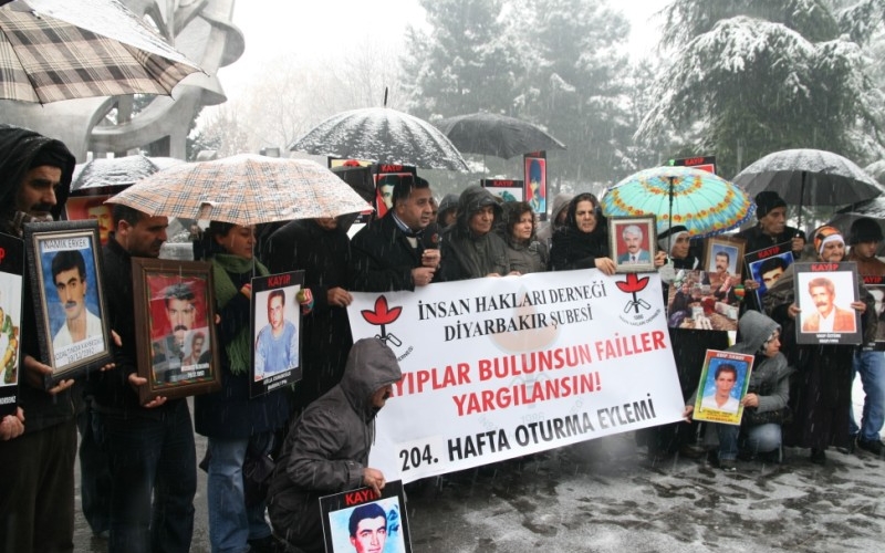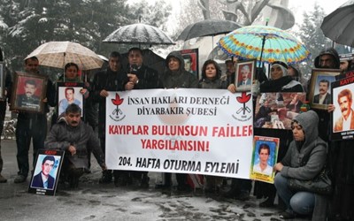 İHD Diyarbakır Şubesi ve kayıp yakınlarının her hafta Koşuyolu Parkı Yaşam Anıtı önünde "Kayıplar bulunsun failler yargılansın" sloganıyla gerçekleştirdikleri oturma eylemi 204’üncü haftada da devam etti. Eyleme İHD MYK Üyesi ve Doğu-Güneydoğu Anadolu Bölge Temsilcisi Şevket Akdemir, İHD Diyarbakır Şube Başkanı Raci Bilici, Barış Anneleri İnisiyatifi, MEYADER üyeleri, KESK’e bağlı sendikaların temsilcilerinin yanı sıra kayıp yakınları katıldı. Kar yağışı altında kayıplarının akıbetini soran kayıp yakınları, "Kayıplar bulunsun failler yargılansın" pankartı açarak, faili meçhul bir şekilde kaybedilen yakınlarının fotoğraflarını taşıdı.