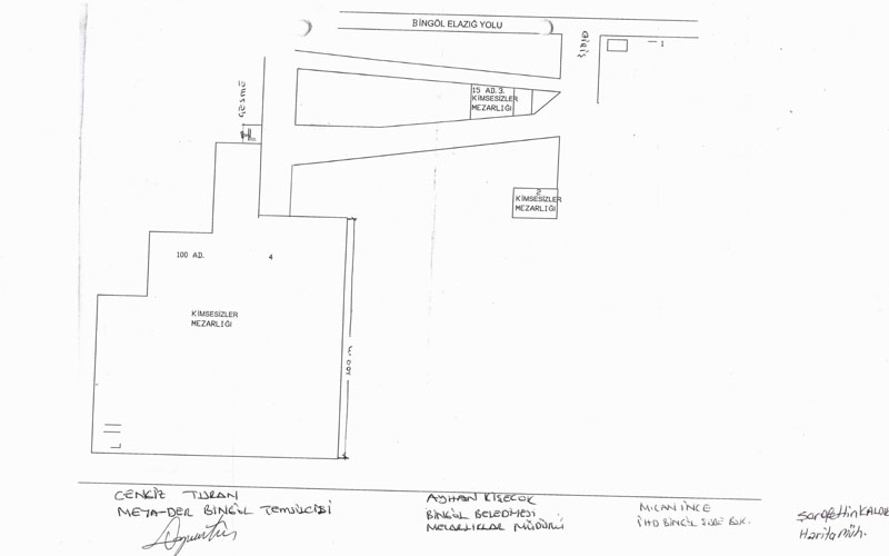 Çalışmalarının sonucunda elde ettikleri veriler ve oluşturdukları krokilerle mezarlıkta yeni bir çalışma daha başlattıklarını söyleyen Turan, çok daha trajik bir tablo ile karşılaştıklarını belirtti. Turan, "Kimsesizler Mezarlığı diye tabir edilen alanın ailelerce, belediyenin göz yumması sonucu işgal edildiğini ve buranın 'Aile Kabristanlığı'na çevrildiğini öğrendik. Daha sonra belediye ile mezarlıkta yaptığımız çalışmalarda kimi naaşların yerinden çıkarıldığını, kimilerinin tahrip edildiğini öğrenmiş olduk. Bunun üzerine İHD Bingöl Şubesi aracılığı ile belediye hakkında savcılığa suç duyurusunda bulunduk. Bu başvurumuz takipsizlikle sonuçlandı. Soruşturma izni verilmedi. Bunun akabinde biz Bingöl Belediyesi ile görüşmelere başladık. Tabloyu kendi önlerine koyduk" dedi.
