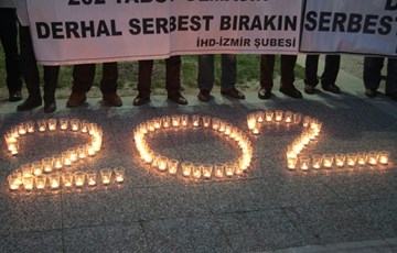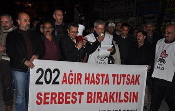 İHD İzmir Şubesi, Eski Sümerbank önünde basın açıklaması düzenledi. Açıklamaya çok sayıda kişinin yanı sıra BDP İzmir İl Eş Başkanı Yusuf Kaya, Tutuklu Aileleri Yardımlaşma Derneği (TAY-DER) İzmir Şube Başkanı Dünyamalı Ariç ve üyeleri de destek verdi. "Hasta mahpuslar sahipsiz değildir", "202 hasta tutsak 202 tabut olmasın, derhal serbest bırakın", "Hasta mahpuslar derhal serbest bırakılsın" pankartlarının açıldığı açıklamanın yapıldığı alana cezaevlerinde bulunan 202 hasta tutsak için 202 mum yakıldı. Grup adına açıklamayı okuyan İHD İzmir Şube üyesi Caner Canlı, 202 hasta tutsağın cezaevinde ölümle pençeleştiğini ifade ederek, "202 mumla 202 eriyen bedenden bahsediyoruz, 202 ağır hasta mahpustan" dedi.