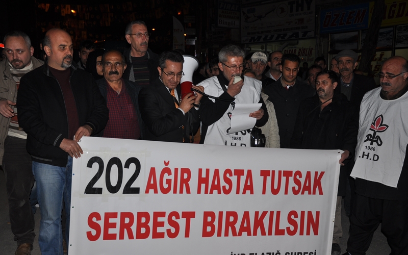 İHD Elazığ Şubesi'nin yaptığı basın açıklaması, Hozat Garajı'nda gerçekleşti. Basın açıklamasına, BDP Elazığ Belediye Eş Başkan Adayı Gönül Taş da katıldı. Açıklamayı yapan İHD yöneticisi Behzat Azır, "Hasta mahkumları cezaevlerinden tabutla değil umutla karşılamak istiyoruz" dedi. 202 ağır mahpusun yalnız bırakmayacaklarını belirten Azır, "Onlar içeride yaşama tutundukça bizler onları cezaevlerinden tabutlarla değil umutlarla alalım diye susmayacağız, haykıracağız. Bir tek mum daha sönmeden, bir tek mahpus daha ölmeden 202 ağır hasta 202 evlat, 202 arkadaş, 202 yoldaş, 202 can serbest bırakılmalıdır'' dedi.