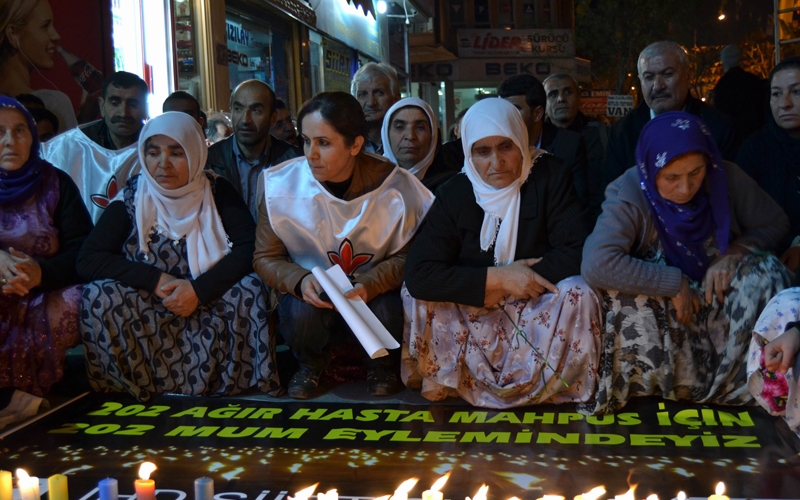 İHD Diyarbakır Şubesi, cezaevlerinde bulunan 202'si ağır 620 ağır hasta tutsağın durumuna dikkat çekmek amacıyla Diyarbakır E Tipi Kapalı Cezaevi önünde mumlu oturma eylemi gerçekleştirdi. Oturma eyleminden "Cezaevlerinde yüzlerce hasta tutsak var. Ölüyorlar daha ne kadar sessiz kalacaksınız. Susma suça ortak olma hasta mahpuslara özgürlük" yazılı pankart açılırken, cezaevlerinde yaşamını yitirirken tutsakların isimlerinin yazılı olduğu dövizler taşındı. Etkinliğin gerçekleştiği alana 202 hasta tutsağın temsilen mumlar yakıldı. Oturma eyleminden önce kısa bir açıklama yapan İHD Diyarbakır Şubesi Başkanı Raci Bilici, gözleri görmeyen, elleri ayakları tutmayan, bir insanı yaşama bağlayan organları çalışmayan mahpusların olduğu bir ülkede olduklarını kaydederek, Türkiye cezaevlerinde 202'si ağır olmak üzere toplam 620 hasta tutuklunun bulunduğunu belirtti. Bilici, hasta tutuklulara yönelik infaz hükümlerinin değiştirilmesi için imza kampanyası başlatacaklarını söyledi Açıklama sonrası 5 dakikalık oturma eylemi gerçekleştirildi.