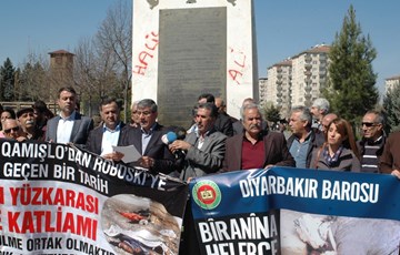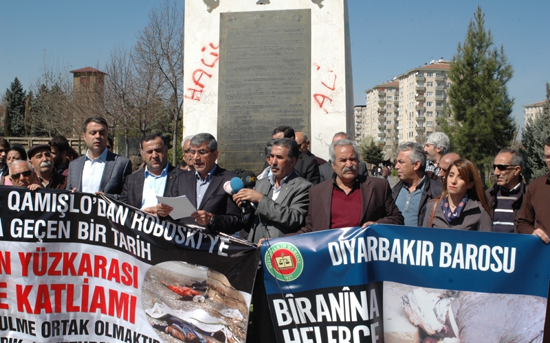 Diyarbakır İnsan Hakları Derneği (İHD) ve Diyarbakır Barosu, Halepçe katliamında yaşamını yitirenleri anmak amacıyla Koşuyolu Parkı İnsan Hakları Anıtı önünde basın açıklaması gerçekleştirdi. "Biranina Halepçe Halepçe'yi anıyoruz" ile "Enfal'den Halepçe'ye Qamışlo'dan Roboski'ye katliamlarla geçen bir tarih" pankartlarının açıldığı açıklamada konuşan Diyarbakır Barosu Başkanı Tahir Elçi, 16 Mart 1988 tarihinde Federal Kürdistan'da ırkçı Baas rejimi tarafından gerçekleştirilen Halepçe katliamını kınadığını belirterek, "Umudun ve özgürlüğün habercisi olan Newroz'a günler kala Halepçe semalarında ölüm bulutları çökmüştü. Güneşli bir bahar sabahı kimyasal silahlarla çoğu çocuk, kadın ve yaşlılardan oluşan tümüyle sivil beş binden fazla insan katledildi" dedi. Uluslararası toplumun Kürt halkına karşı Halepçe'de işlenen soykırım suçuna karşı sessiz kaldığını belirten Elçi, Birleşmiş Milletler'in dünyanın bazı ülkelerinde işlenen soykırım suçlarını soruşturmak amacıyla geçici Uluslararası Ceza Mahkemeleri kurduklarına dikkat çekerek, "Neden Kürtler için bu yapılmıyor ?" diye sordu.