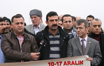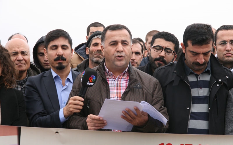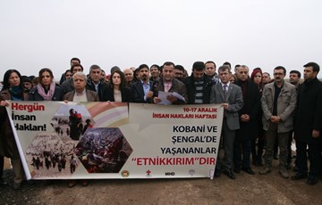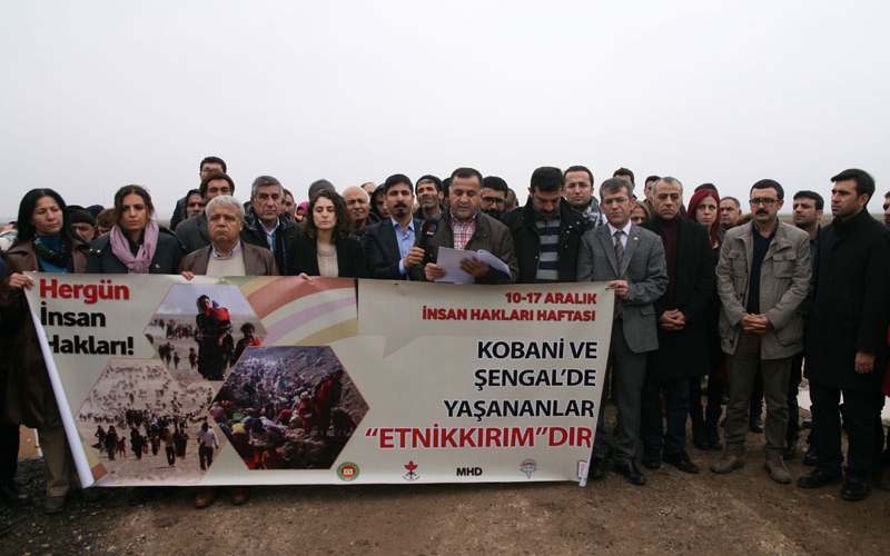 Düzenleyici 5 kurum adına hazırlanan ortak basın metnini İHD Genel Başkan Yardımcısı ve Diyarbakır Şube Başkanı Raci Bilici okudu. İnsan Hakları Evrensel Bildirgesi’nin Birleşmiş Milletler tarafından kabul edilişinin 66’ıncı yıldönümü olduğunu hatırlatan Bilici, aylardır görkemli bir direnişe sahne olan Kobanê sınırında bulunuyor olmalarının önemine değindi.