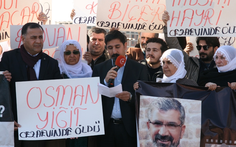 Açıklamada ilk olarak söz alan Diyarbakır Tabip Odası Başkanı Dr Cengiz Günay, konuşmasına geçtiğimiz haftalarda katledilerek yaşamını yitiren Diyarbakır Baro Başkanı Tahir Elçi’ye anarak başladı. Cezaevlerinde 300’ü ağır olmak üzere 750 hasta mahpusun bulunduğunu söyleyen Günay, bu verilerin dışında tespit edilememiş ve hastalık tanısı henüz konmamış birçok hasta mahpusun bulunduğu belirtti. Uygun olmayan barınma ve beslenme koşullarında tutulan mahpusların, cezaevlerinde sağlığa erişim sıkıntılarının bulunması sebebiyle infaz koruma memurlarının insafına terk edildiğini ifade eden Günay “Yazın sıcak kışın soğuk olan ve ring araçları ile hastanelere götürülen ve hasta mahpus koğuşlarının olmadığı koşullarda, hastaların tanı ve tedavisi yapılamamaktadır” diye konuştu.