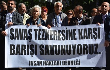 İnsan Hakları Derneği (İHD) Genel Merkezi, 1 Ekim'de Meclis gündemine gelecek olan Suriye-Irak Tezkeresi'ne dair Yüksel Caddesi'nde basın açıklaması düzenledi. Açıklamada, "Savaş Tezkeresine Karşı Barışı Savunuyoruz" pankartı açıldı.