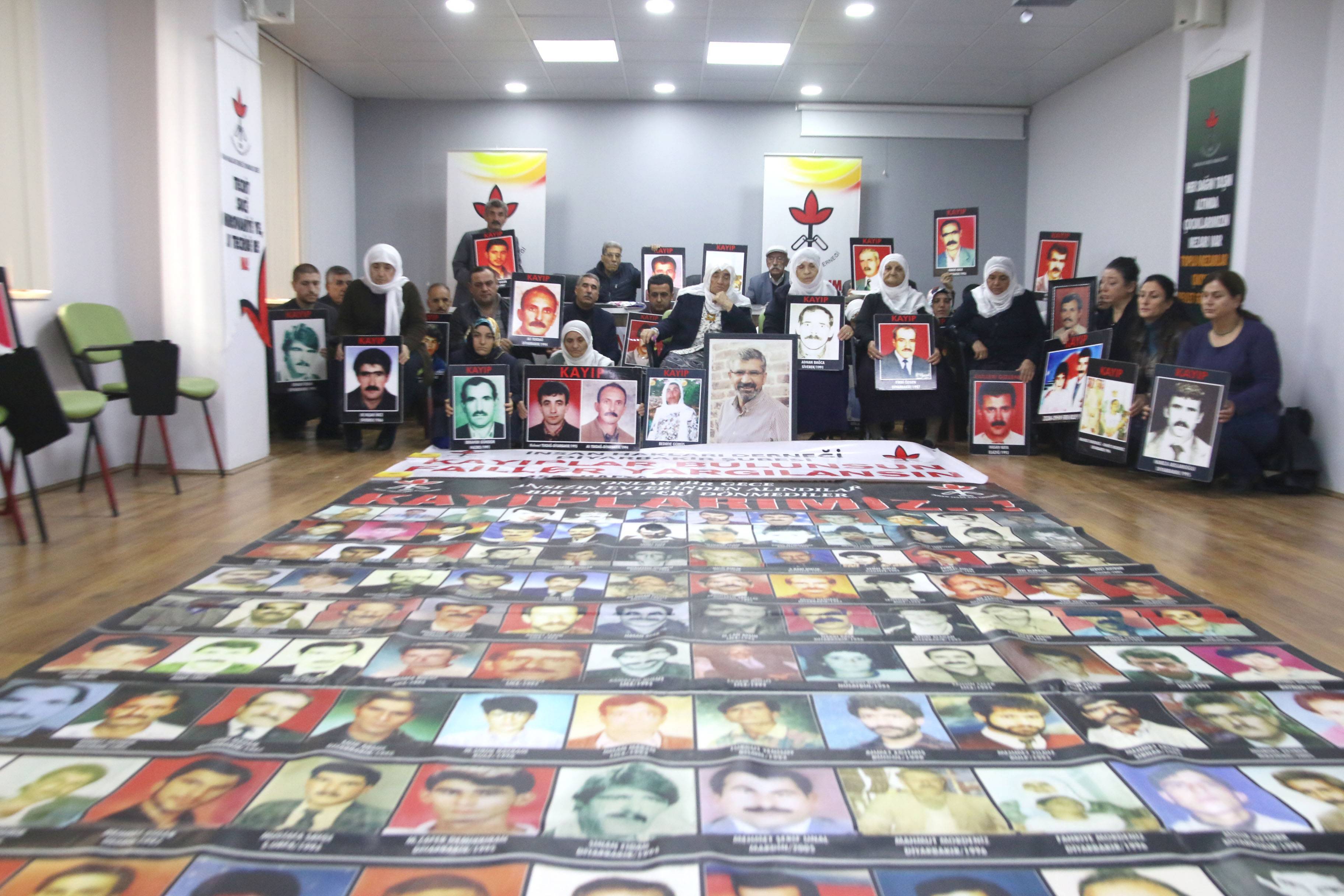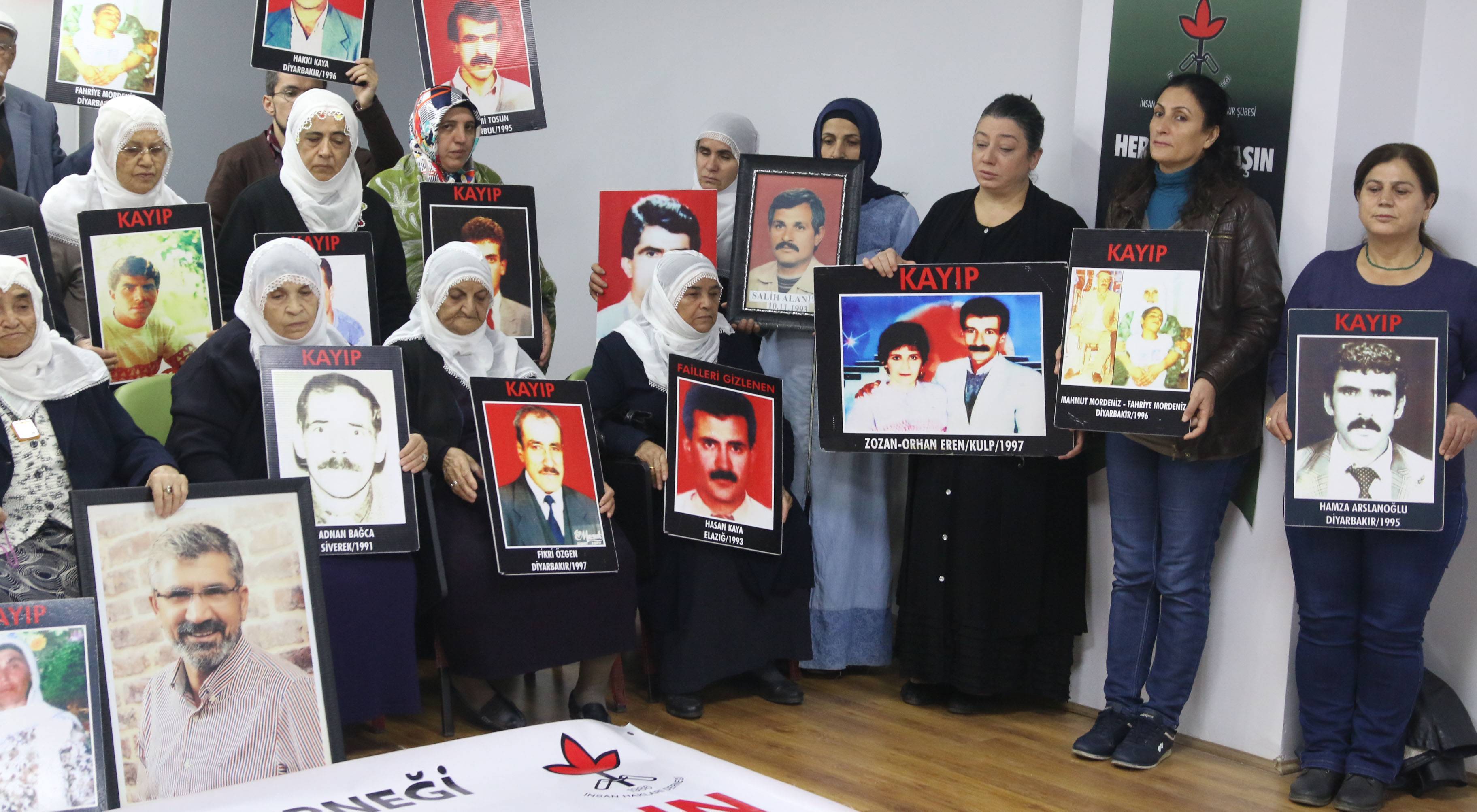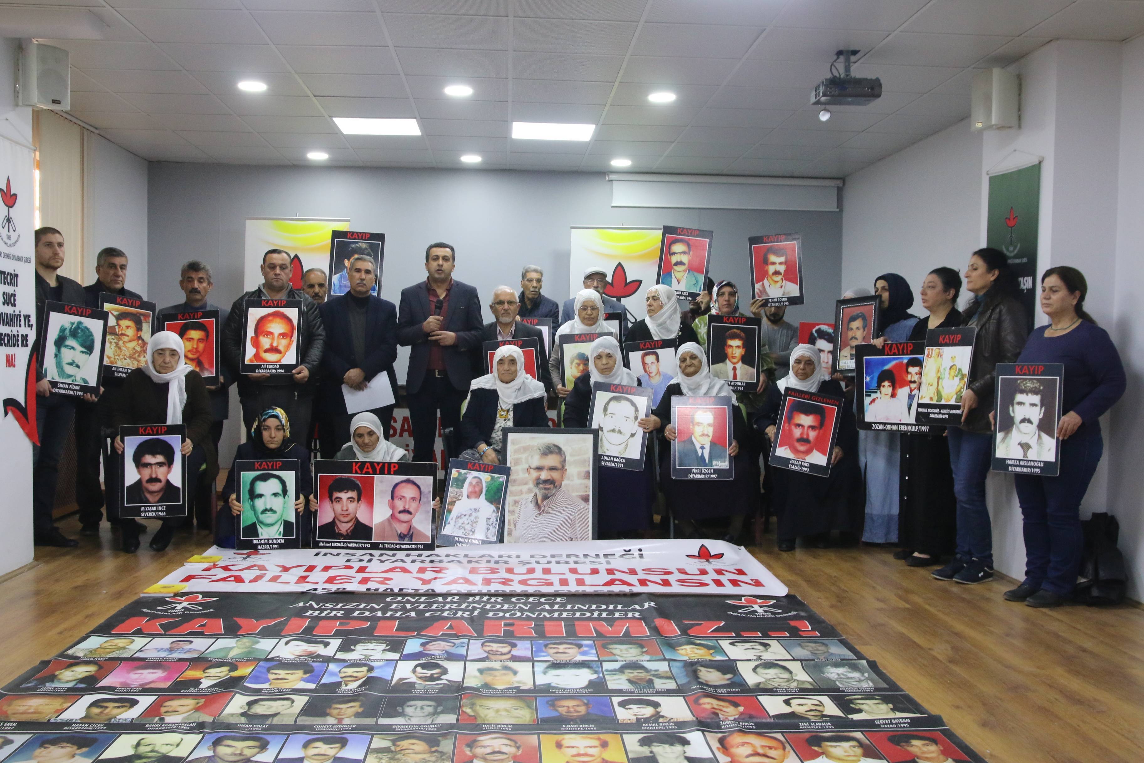 İnsan Hakları Derneği (İHD) Diyarbakır Şubesi ve kayıp yakınları, “Kayıplar bulunsun, failler yargılansın” şiarıyla her hafta düzenledikleri oturma eyleminin 458’incisini gerçekleştirdi. Diyarbakır Valiliği tarafından Koşuyolu Parkı’ndaki İnsan Hakları Anıtı önünde gerçekleştirilmesine izin verilmeyen eylem, geçmiş haftalarda olduğu gibi İHD Diyarbakır Şube binasında gerçekleştirildi. Kayıpların fotoğraflarının taşındığı eyleme İHD Diyarbakır Şubesi yönetici ve üyeleri, kayıp yakınları, barış anneleri ve insan hakları aktivistleri katıldı. Eylemde, 1994 yılında Diyarbakır'ın Dağkapı semtinde silahlı sivil kişiler tarafından kaçırılan ve 23 yıldır kendisinden bir daha haber alınamayan Ali Tekdağ'ın akıbeti soruldu.