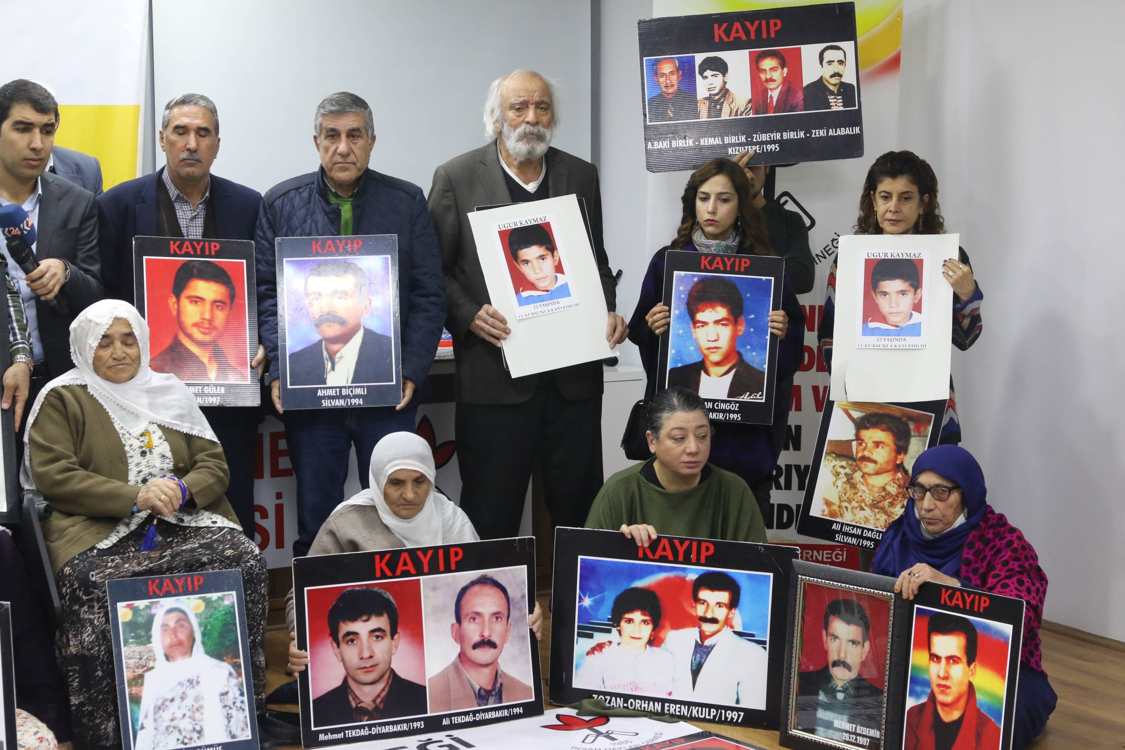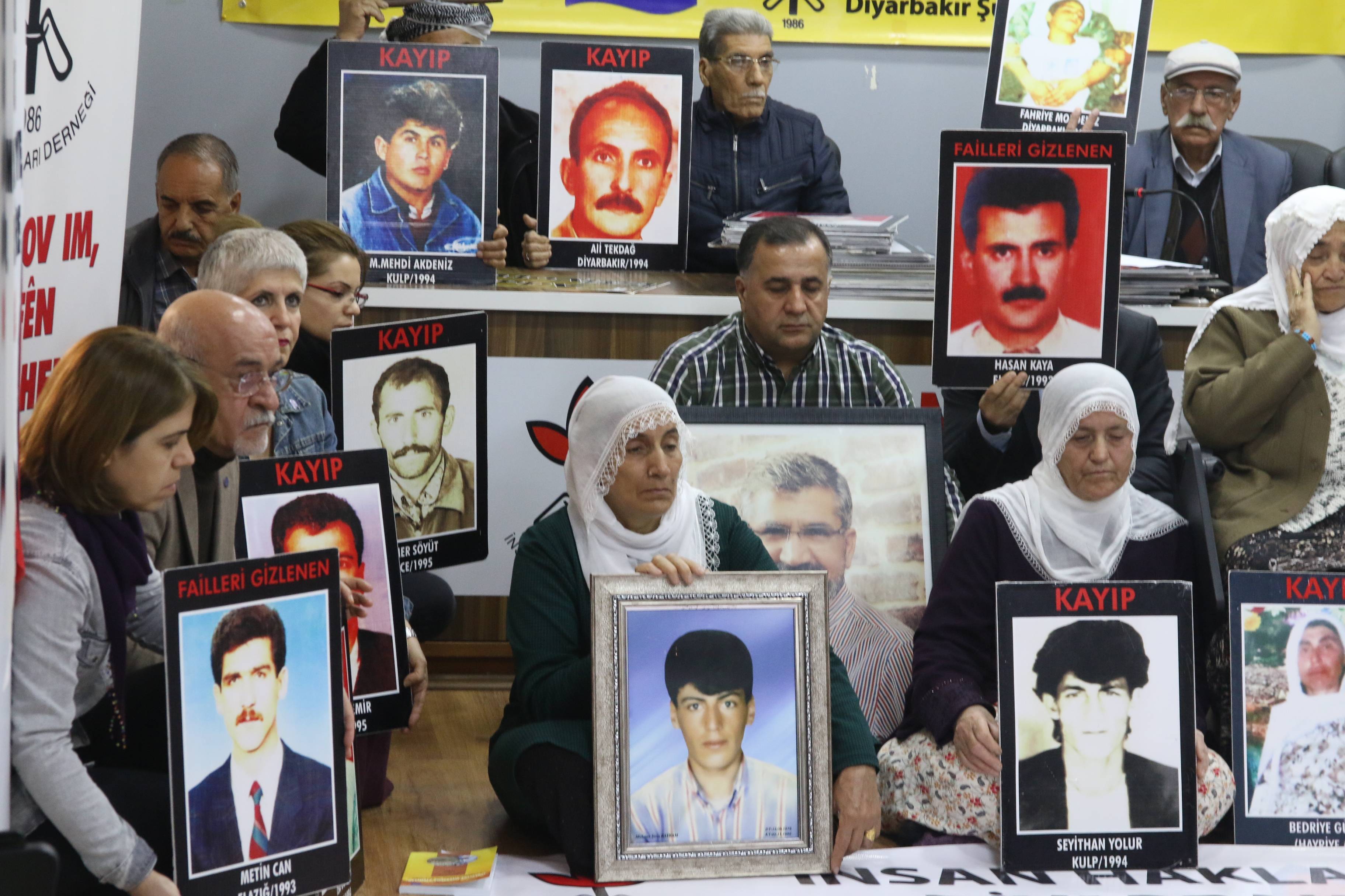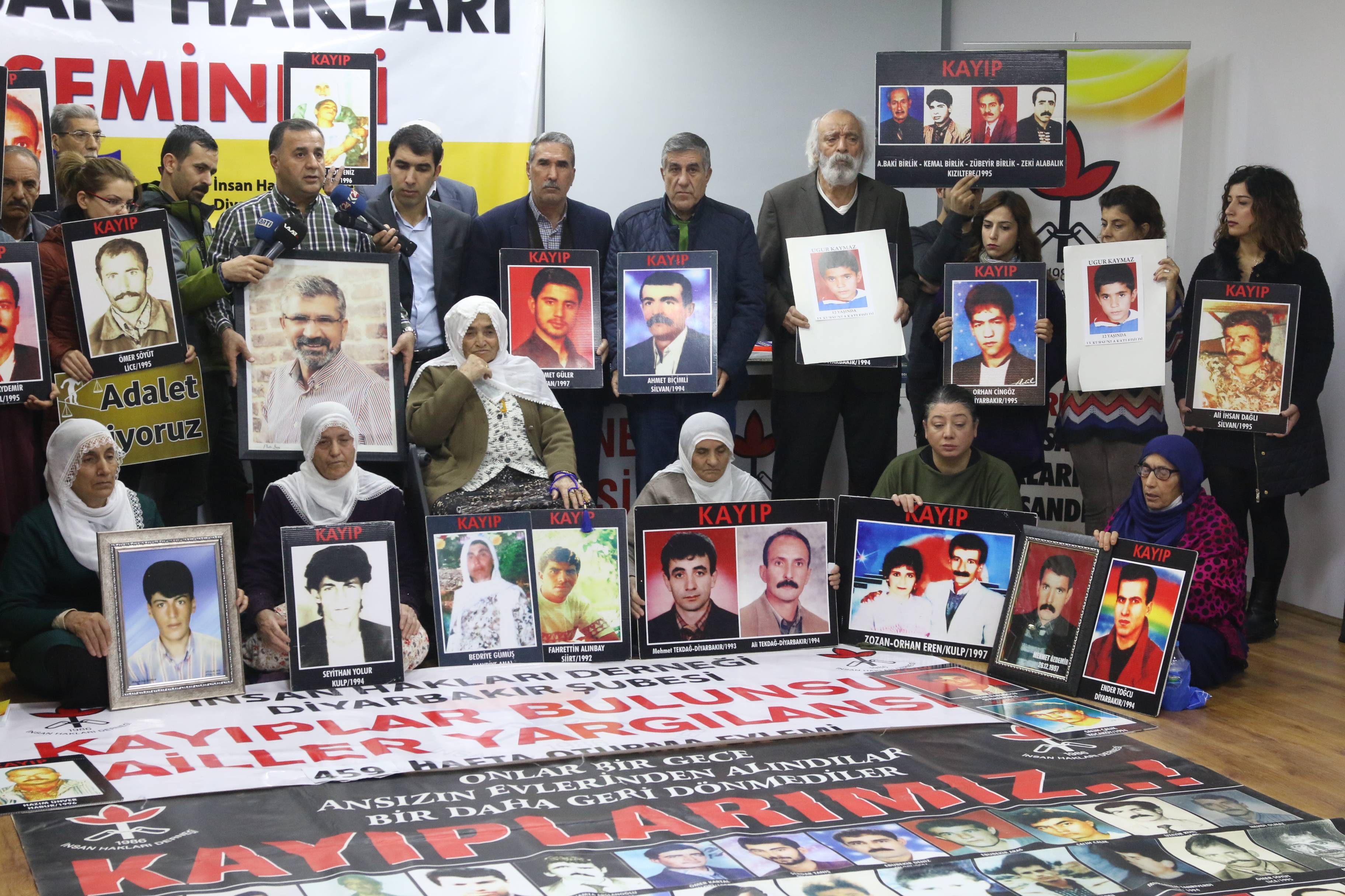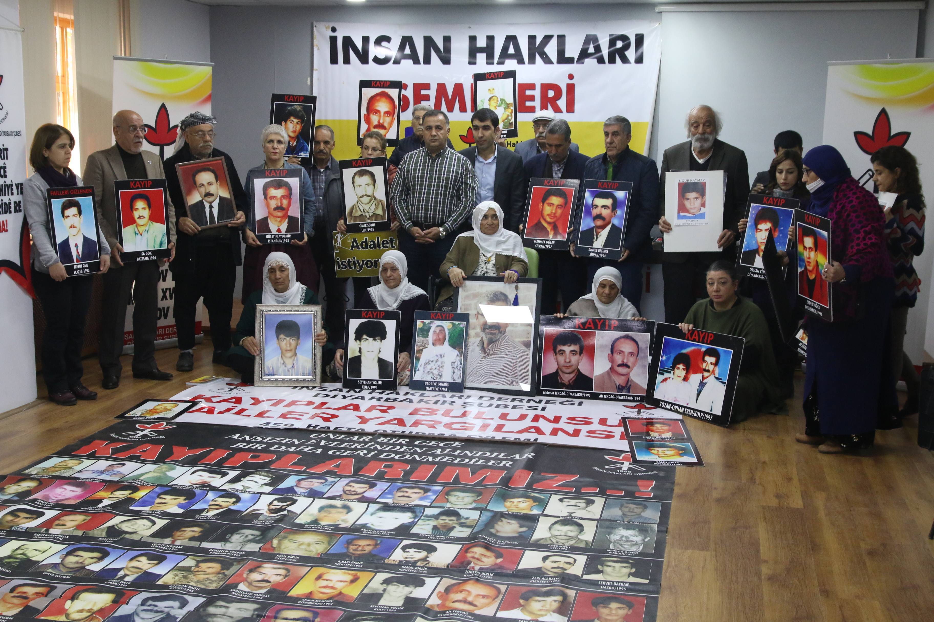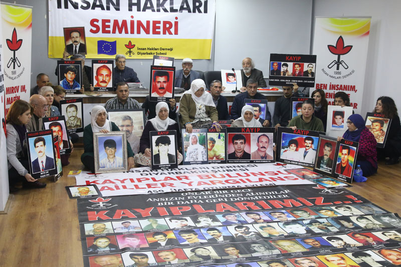 İnsan Hakları Derneği (İHD) Diyarbakır Şubesi ve kayıp yakınları, “Kayıplar bulunsun, failler yargılansın” şiarıyla her hafta düzenledikleri oturma eyleminin 459’uncusunu gerçekleştirdi. Diyarbakır Valiliği tarafından Koşuyolu Parkı’ndaki İnsan Hakları Anıtı önünde gerçekleştirilmesine izin verilmeyen eylem, geçmiş haftalarda olduğu gibi İHD Diyarbakır Şube binasında gerçekleştirildi. Kayıpların fotoğraflarının taşındığı eyleme İHD Diyarbakır Şubesi yönetici ve üyeleri, kayıp yakınları, barış anneleri ve insan hakları aktivistleri katıldı. Eylemde, 28 Kasım 2015 tarihinde Sur’da katledilen Diyarbakır Baro Başkanı Tahir Elçi’nin faillerinin açığa çıkartılması talep edildi.