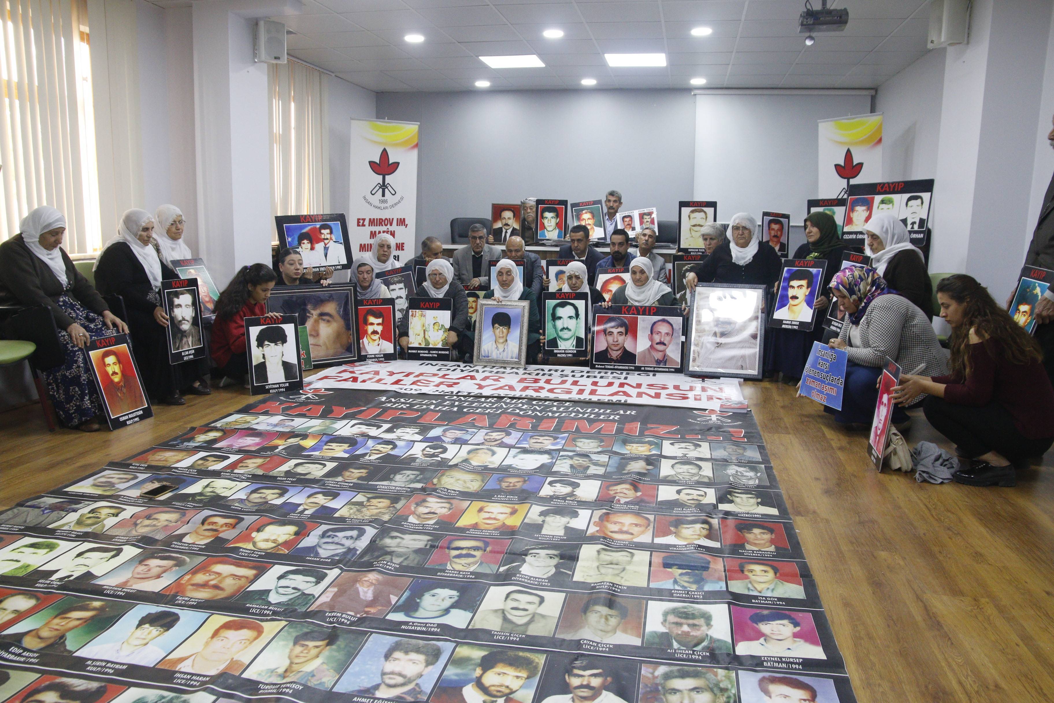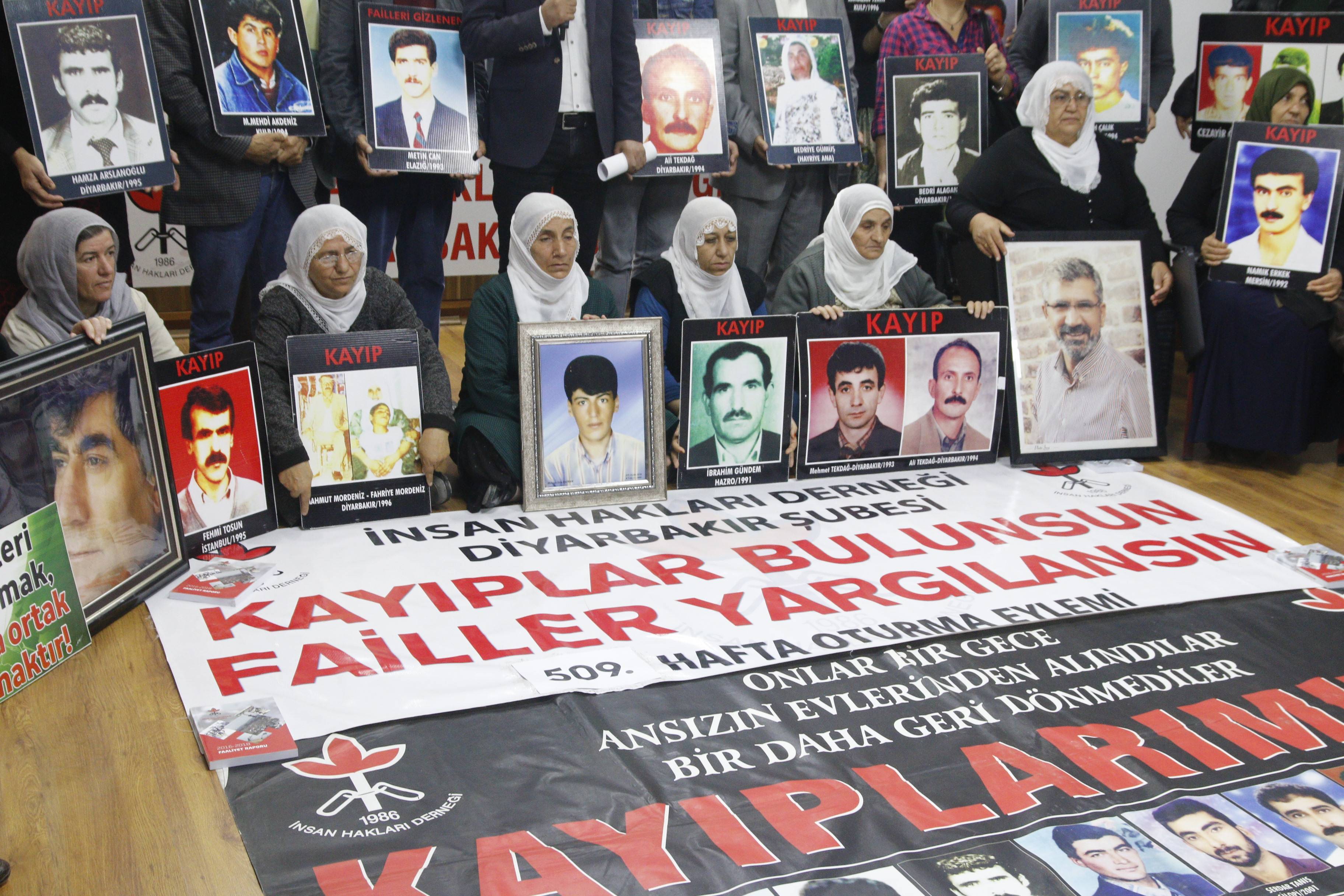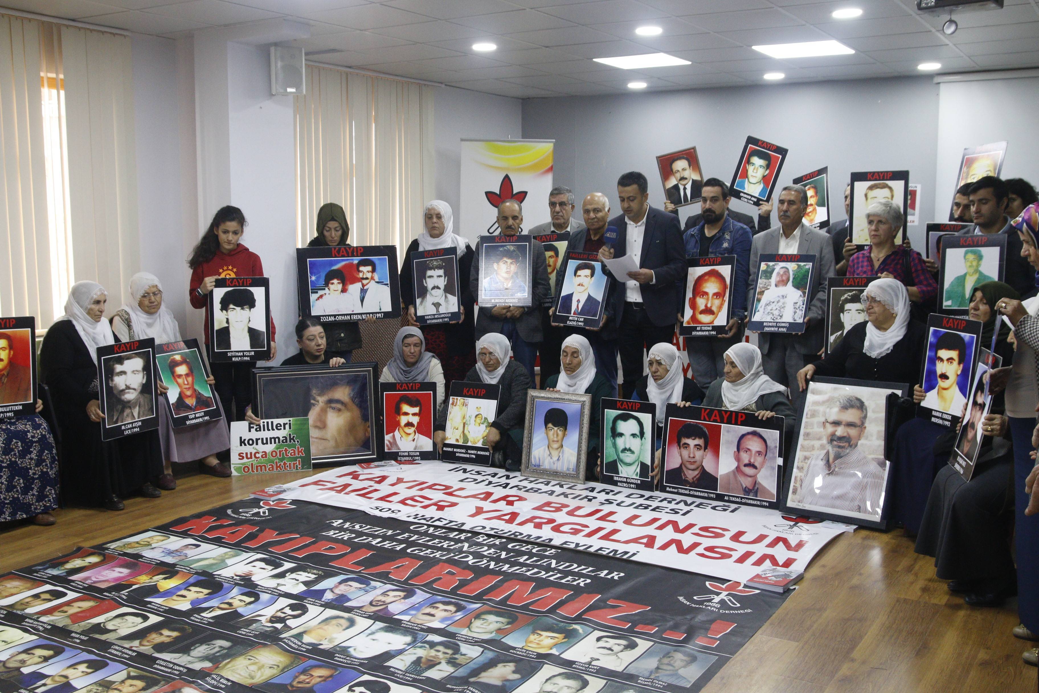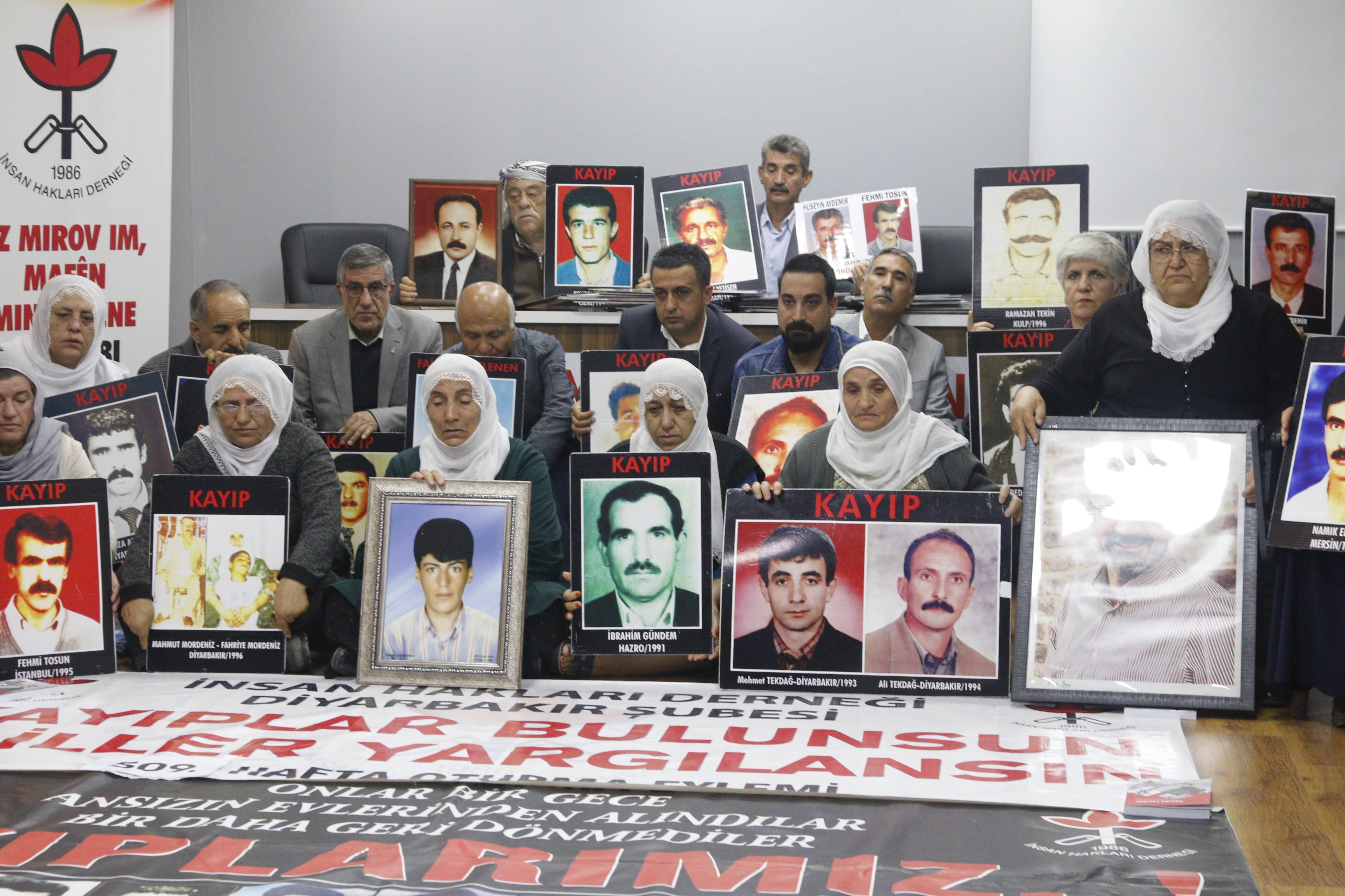 İnsan Hakları Derneği (İHD) Diyarbakır Şubesi ve kayıp yakınları tarafından “Kayıplar bulunsun, failler yargılansın” sloganıyla her hafta düzenlenen oturma eylemlerinin 509’üncusu, Valiliğin kayıp eylemlerini yasaklayan keyfi ve hukuk dışı kararı nedeniyle İHD Diyarbakır Şube binasında gerçekleştirildi. Eylemden önce şube binasının bulunduğu sokağın tamamen ve Koşuyolu Parkı Yaşam Hakkı Anıtının polis tarafından abluka altına alındığı görüldü. Şube binasında gerçekleşen ve kayıpların fotoğraflarının taşındığı eyleme İHD Diyarbakır şube yöneticileri ve üyeleri, İHD Bölge Temsilcisi Abdusselam İnceröen, KESK Şubeler Platformu, Barış Anneleri Meclisi Üyeleri, kayıp yakınları ve insan hakları aktivistleri katıldı. Eylemde, 1994 yılında Diyarbakır’da 1994 yılında Diyarbakır’da gözaltına alınan ve kendisinden bir daha haber alınamayan Ali Tekdağ’ın akıbeti soruldu.