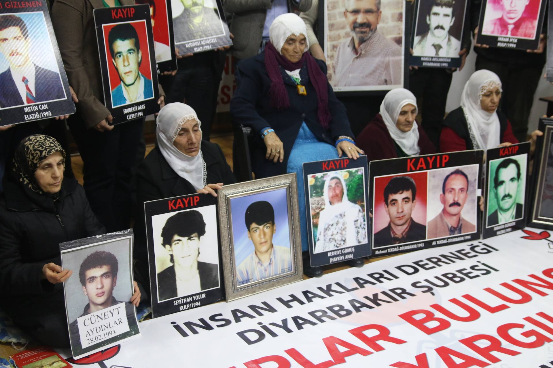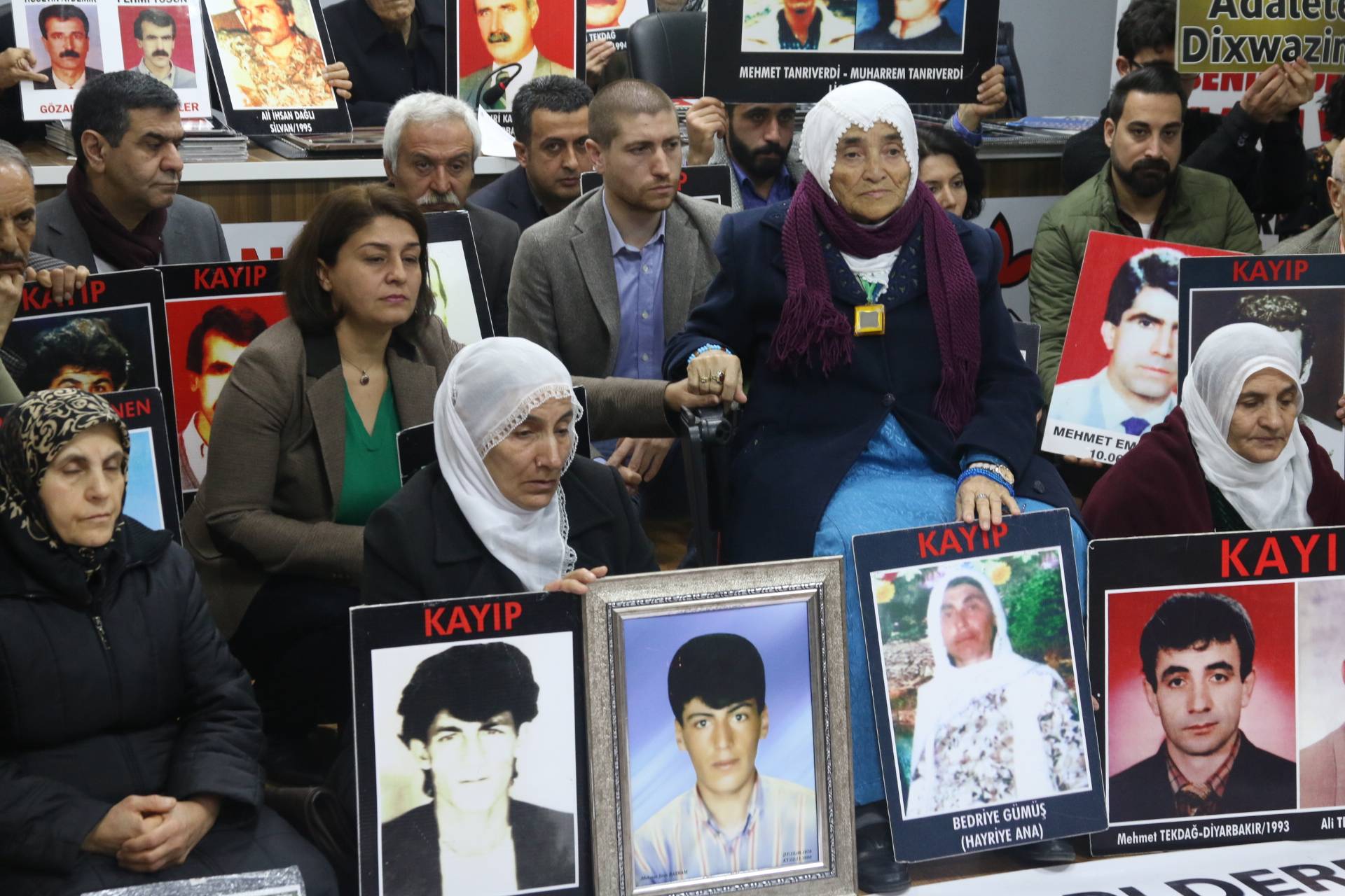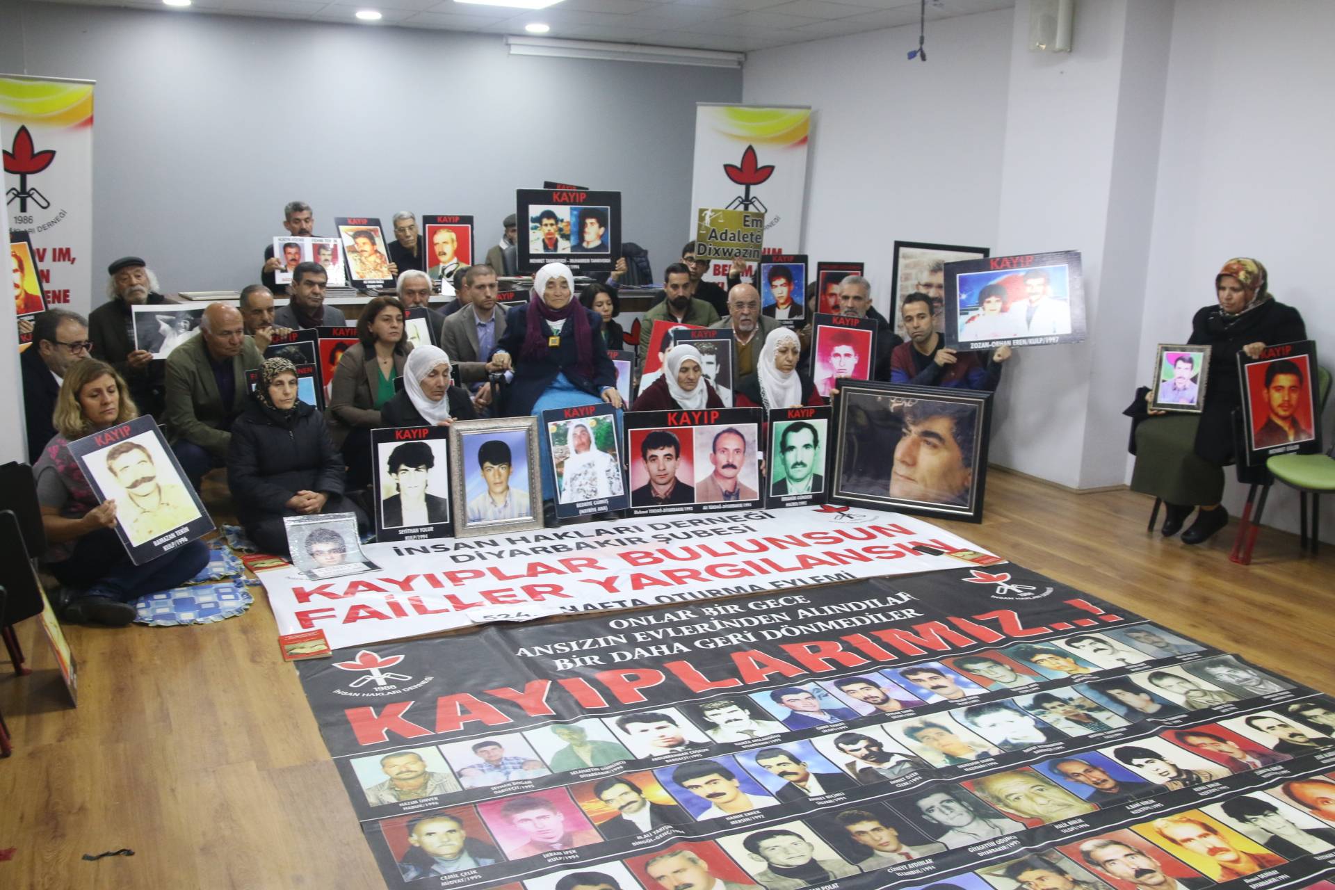 İnsan Hakları Derneği (İHD) Diyarbakır Şubesi ve kayıp yakınları tarafından “Kayıplar bulunsun, failler yargılansın” sloganıyla her hafta düzenlenen oturma eylemlerinin 524’üncüsü, Valiliğin kayıp eylemlerini 25 haftadır yasaklayan keyfi ve hukuk dışı kararı nedeniyle İHD Diyarbakır Şube binasında gerçekleştirildi. Eylemden önce şube binasının bulunduğu sokağın polis tarafından abluka altına alındığı görüldü. Şube binasında gerçekleşen ve kayıpların fotoğraflarının taşındığı eyleme İHD Şube yönetici ve üyeleri, HDP Diyarbakır Büyükşehir Belediyesi Eş Başkan Adayları Adnan Selçuk Mızraklı ve Hülya Alökmen Uyanık, CHP Diyarbakır İl Başkanı Mehmet Sayın, TMMOB İç Mimarlar Odası Diyarbakır İl Temsilcisi Hasan Pekdoğan, kayıp yakınları ve insan hakları aktivistleri katıldı. Eylemde, 17 Şubat 1992 tarihinde Mardin’in Nusaybin ilçesine bağlı Kuşkaya köyünde koruculuk dayatmalarına karşı gerçekleştirilen toplumsal gösteri sırasında, askerlerce açılan ateş sonucu yaşamını yitiren Bedriye Gümüş ve 5 köylünün faillerinin bulunarak cezalandırılması talep edildi.