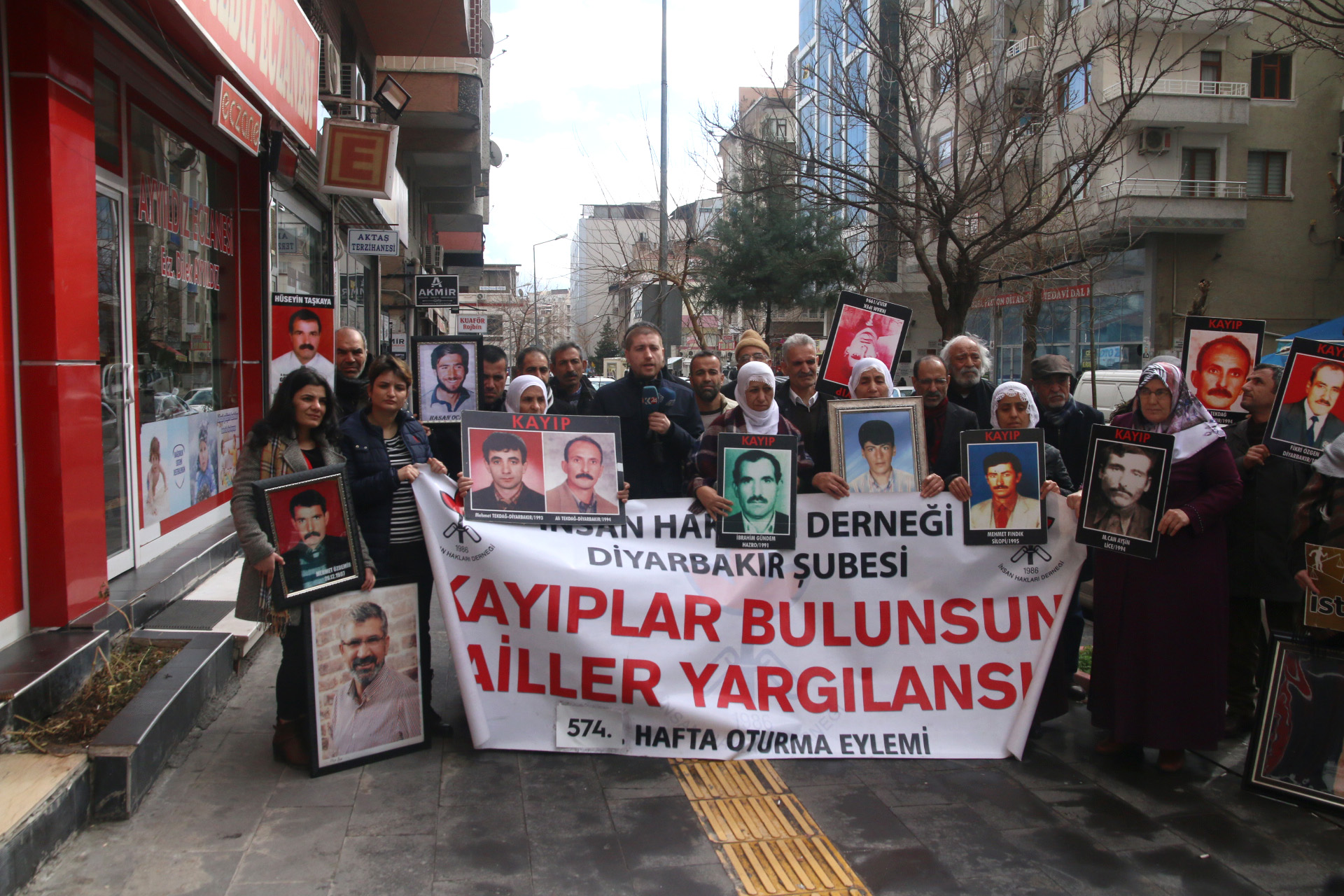 Eylemde bir konuşmada bulunan İHD Diyarbakır Şube Başkanı Abdullah Zeytun, 574 haftadır kayıpların bulunması için adalet talep etmeye ve faillerden hesap sorulması için mücadele etmeye devam ettiklerini söyledi. 90’lı yıllarda kaybetme olaylarından suç işleyen kamu görevlilerinin yüzleşilmesi ve faillerden hesap sorulması gerektiğini söyleyen Zeytun, “Geçmişte yaşanan ağır insan hakları ihlallerine karşı etkin bir cezasızlık sistemi devam etmektedir. Kayıplar bulunsun ve failler yargılansın ve ihlallerin etkin bir şekilde giderilmesi talebimize karşılık, sistemli ve pek çok kategorik konuda ihlallerin devam etmekte olduğunu görüyoruz.” dedi.