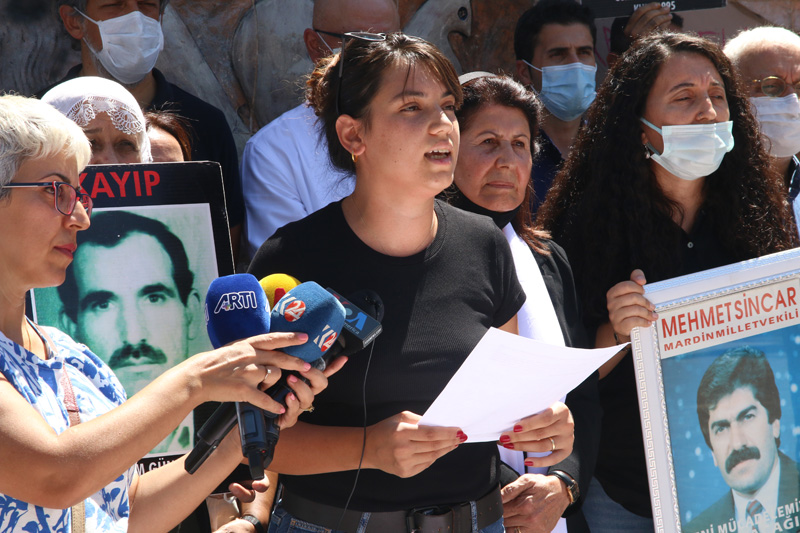 Eylemde açıklamada bulunan Şubemiz Başkan Yardımcısı Ezgi Sıla Demir, Türkiye’de 90’lı yıllarda gerçekleşen zorla kaybetme, yargısız infaz ve faili meçhul cinayetlere ilişkin açılan soruşturma ve dava dosyalarının, zaman aşımı devreye konularak adliye raflarında çürümeye bırakıldığını ve dosyaların kapatılmaya çalışıldığın söyledi.