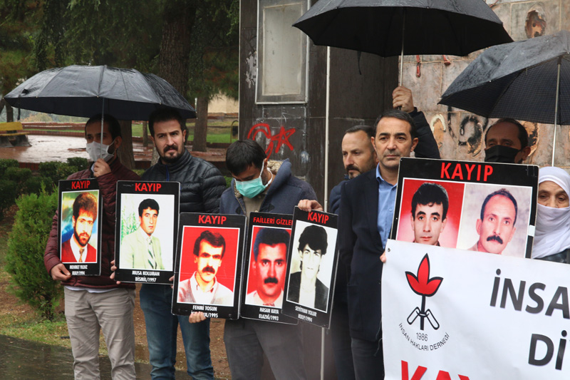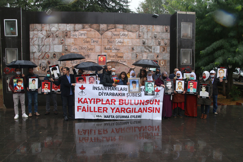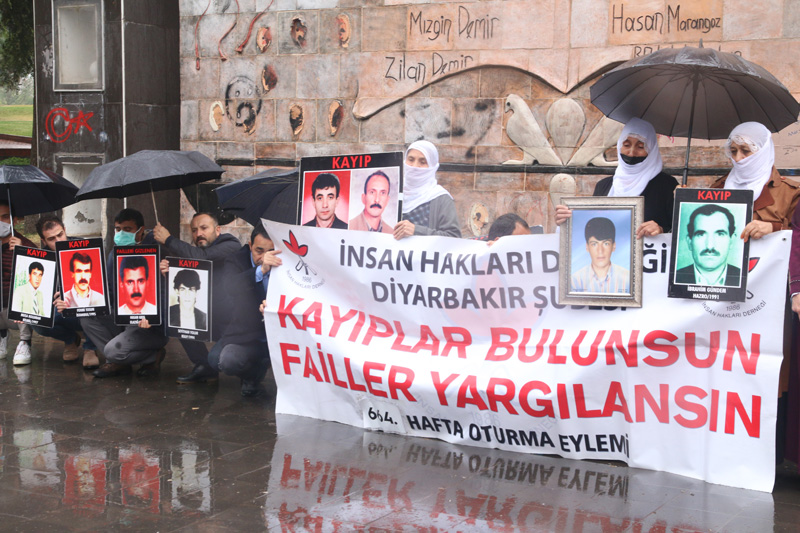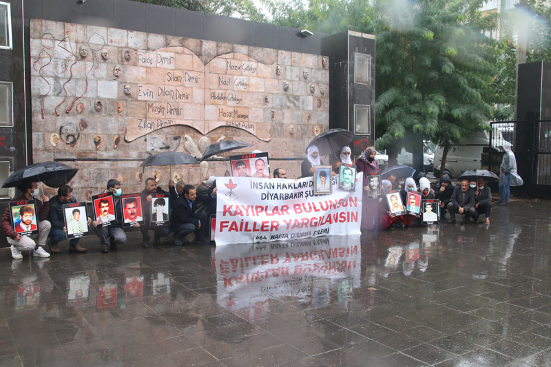 İnsan Hakları Derneği (İHD) Diyarbakır Şubesi ve kayıp yakınlarının "Kayıplar Bulunsun Failler Yargılansın" sloganıyla her hafta ve kesintisiz bir şekilde sürdürdüğü oturma eylemlerinin 664’üncüsü Koşuyolu Parkı Yaşam Hakkı Anıtı önünde gerçekleştirildi. Kayıp resimlerinin taşındığı ve sağanak yağmur altında gerçekleştirilen eyleme, İHD Diyarbakır Şube Yönetim Kurulu Üyeleri, Amed Emek ve Demokrasi Platformu Üyeleri, kayıp yakınları ve insan hakları aktivistleri katıldı.