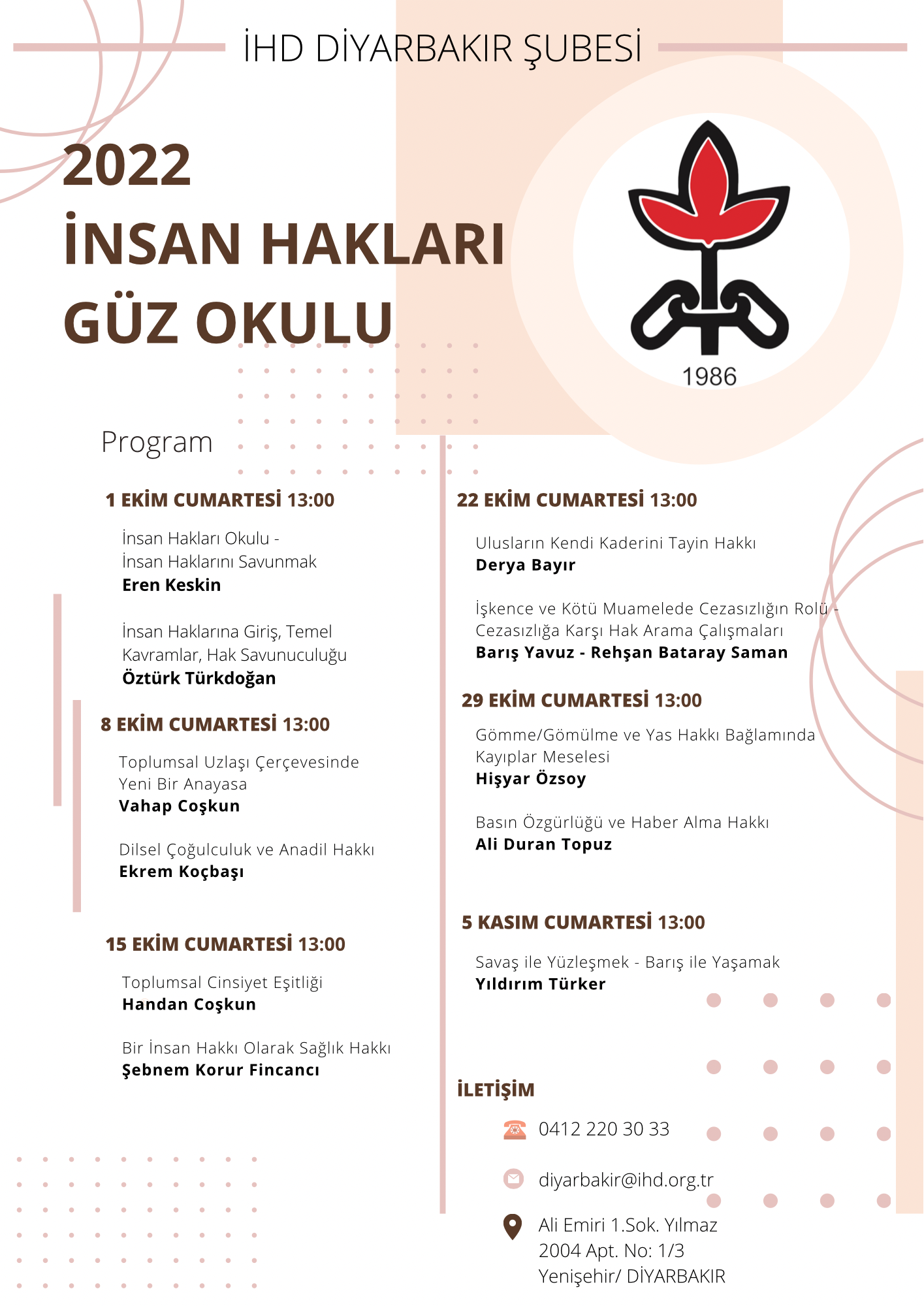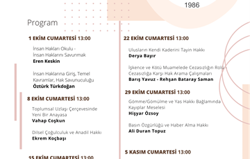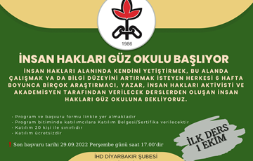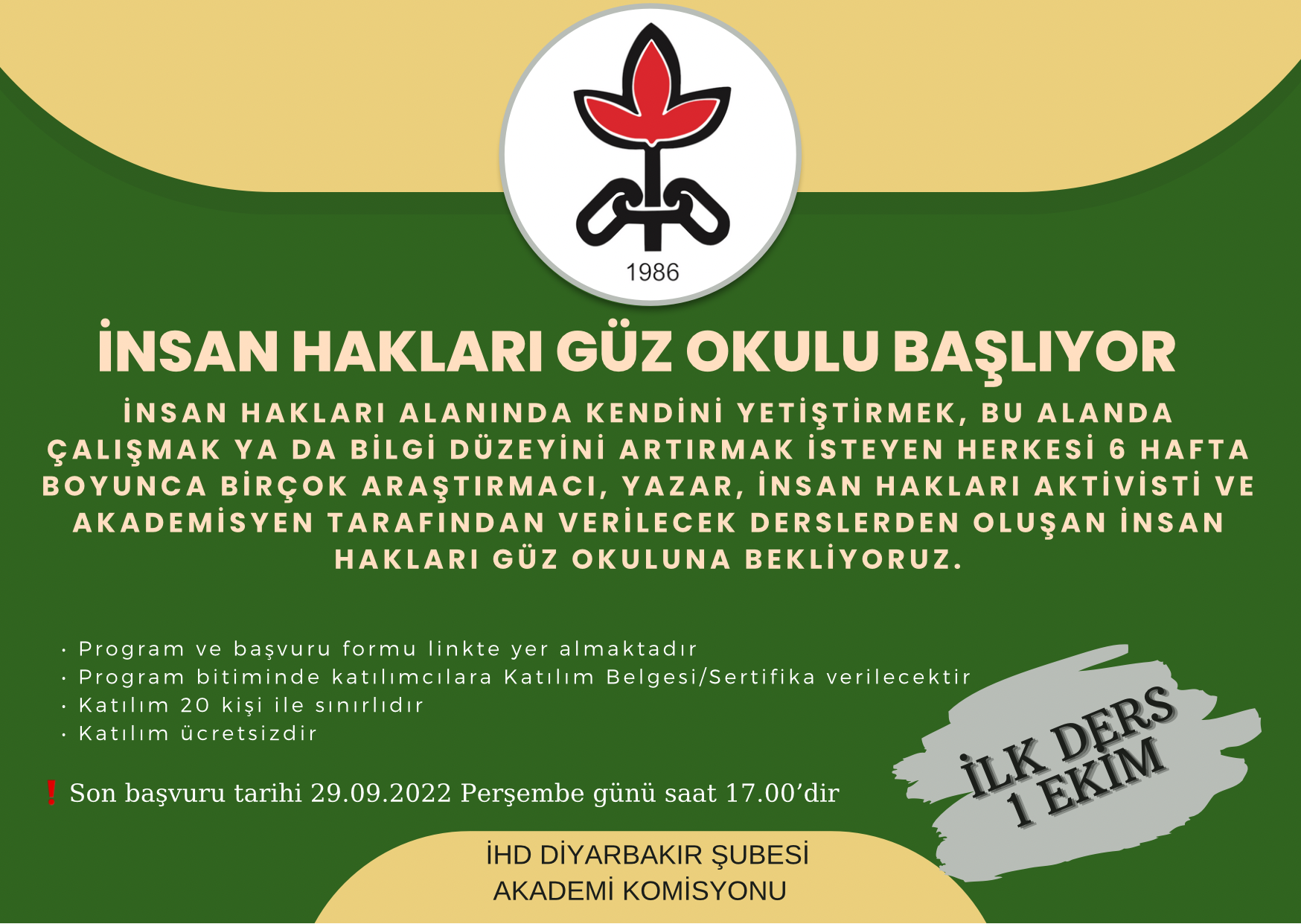 İnsan hakları alanında kendini yetiştirmek, bu alanda çalışmak ya da bilgi düzeyini artırmak isteyen herkesi 6 hafta boyunca çeşitli araştırmacı, yazar, insan hakları aktivisti ve akademisyen tarafından verilecek derslerden oluşan İnsan Hakları Güz Okulu’na bekliyoruz.