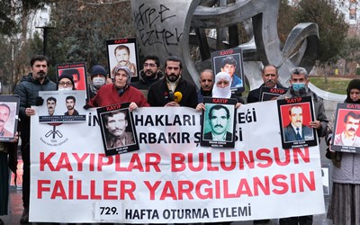 İnsan Hakları Derneği (İHD) Diyarbakır Şubesi ve Kayıp Yakınlarının, “Kayıplar bulunsun failler yargılansın” eyleminin 729’uncu haftası Koşuyolu Parkı Yaşam Hakkı Anıtı önünde gerçekleştirildi. Kayıp yakınları, hak savunucuları ve sivil toplum örgütü temsilcilerinin katıldığı eylemde, kayıpların fotoğrafları taşındı. Bu hafta, Şırnak’ın Silopi ilçesinde 25 Ocak 2001’de gözaltında kaybedilen HADEP ilçe yöneticileri Ebubekir Deniz ve Serdar Tanış’ın akıbeti soruldu.