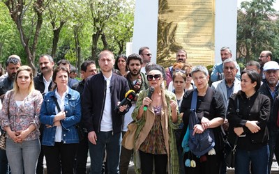 Açıklama öncesi konuşan Eren Keskin, “Bugün hala gözaltına alınan arkadaşlarımız var. Burada genç insan hakları savunucusu arkadaşlarımız da var, 30 yıl bu mücadelenin içinde olan bizler de varız. Bu kader hiç değişmedi. Bu coğrafyadaki her türlü insancıl hak talebi şiddetle bastırıldı. Devlet politikasında hiçbir değişiklik olmadı. Kürt hukukçu, Kürt sanatçı, Kürt sendikacı olmamızdan rahatsızlar. Silahımız yok, neden bizleri gözaltına alıyor, tutukluyor, söz hakkı vermiyorsunuz? Sadece barış istiyoruz. Sadece barışçıl çözüm istediğimiz için cumhuriyetten yana baskı altındayız. Değişik bir devlet politikası; anlamak, çözmek mümkün değil. Konuşmak isteyenleri tutuklamak ne demek? Biz varız ve var olmaya devam edeceğiz" ifadelerini kullandı.
